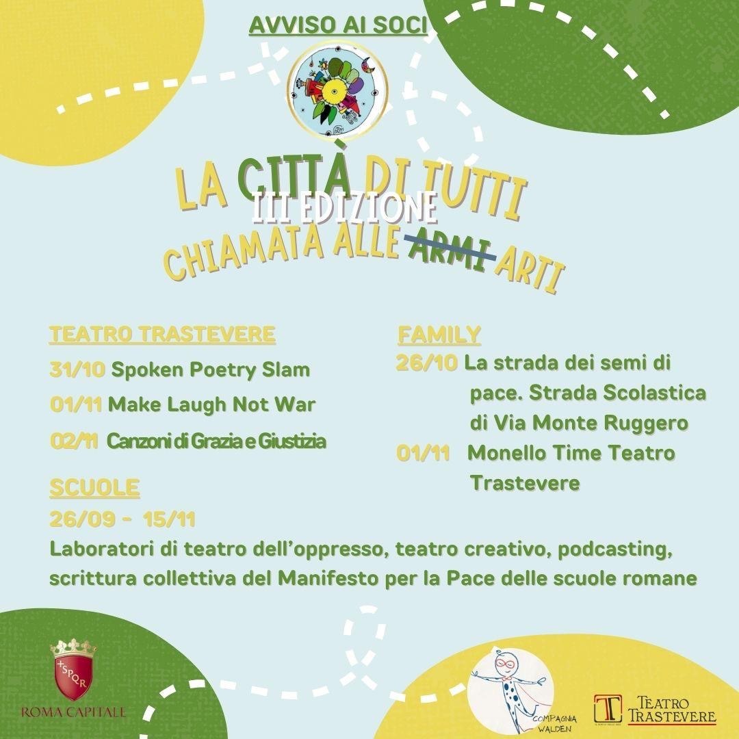 Teatro Trastevere e Compagnia Walden lavorano da tempo tenendo insieme arte e impegno civile, ancora di più da quando è nata La Città di Tutti, che ci ha dato la possibilità di tradurre in azione concreta quello che era un nostro sogno: fare del teatro uno strumento educativo.