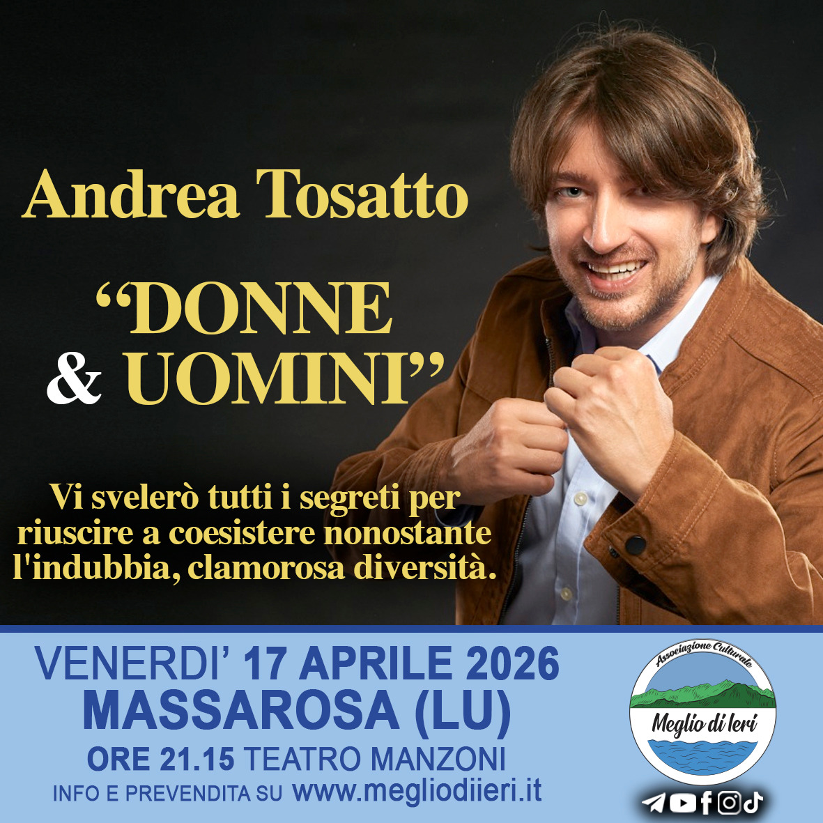 Se vuoi vivere questa esperienza dal vivo, puoi acquistare i biglietti qui: https://www.megliodiieri.it/s/spettacoli/stagione-2026/donne-uomini-di-e-con-andrea-tosatto/