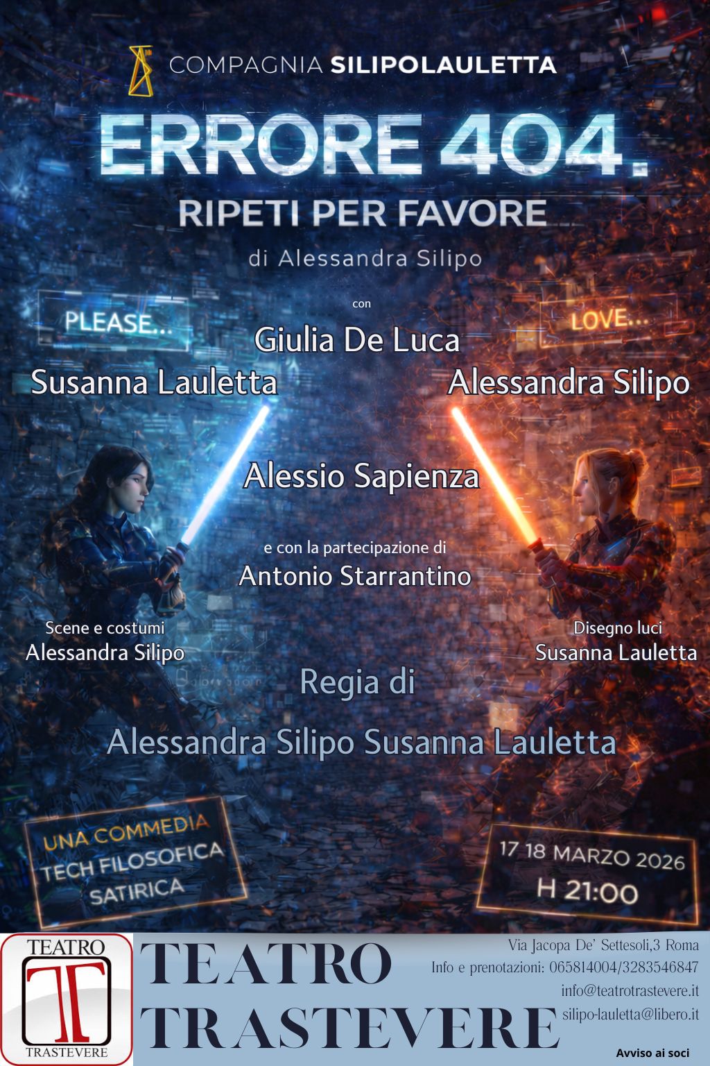 Nel nostro tempo iperconnesso, in cui la tecnologia promette risposte immediate a ogni domanda, emerge un paradosso silenzioso: più strumenti abbiamo per comunicare, più sembra difficile esprimere davvero ciò che sentiamo. Da questa contraddizione nasce Errore 404, uno spettacolo che prende in prestito un codice informatico — quello che segnala una pagina inesistente — per trasformarlo in una metafora dell’esistenza contemporanea. Attraverso assistenti vocali, glitch, comandi gridati nel vuoto e linguaggi frammentati, la scena diventa il luogo in cui tecnologia e umanità si specchiano a vicenda. Non è solo una riflessione sull’intelligenza artificiale, ma soprattutto sul nostro modo di parlare, sentire e relazionarci in un mondo sempre più accelerato e semplificato.